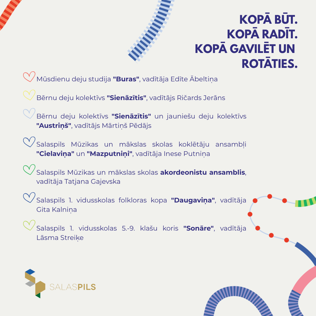 No 5. līdz 13. jūlijam Rīgā norisināsies XIII Latvijas Skolu jaunatnes dziesmu un deju svētki, kuros piedalīsies arī Salaspils novada 9 kolektīvi (20 grupas) ar kopumā 416 dalībniekiem.